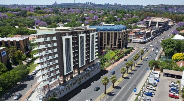 You can’t miss this distinctive arrow-shaped building on Jan Smuts Avenue with its eye-catching angular covered balconies on the corner of the building that offer 280-degree views. There are 75 upmarket furnished and fully equipped apartments available for short-term and corporate rental as well as longer-term leases. The one and two-bedroom apartments range in size from 47m² to 115m² and come with gas stoves, DSTV and fast wifi.
